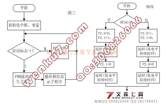 键盘向单片机输入相应控制指令,由单片机通过P2.0与P2.1其中一口输出与转速相应的PWM脉冲,另一口输出低电平,经过信号放大、光耦传递,驱动H型桥式电动机控制电路,实现电动机转向与转速的控制。电动机的运转状态通过LED显示出来。电动机所处速度级以速度档级数显示。正转时数字向右移动,反转时数字向左移动。移动速度分7档,快慢与电动机所处速度级快慢一一对应。每次电动机启动后开始计时,停止时LED显示出本次运转所用时间,时间精确到0.1s。(毕业设计)