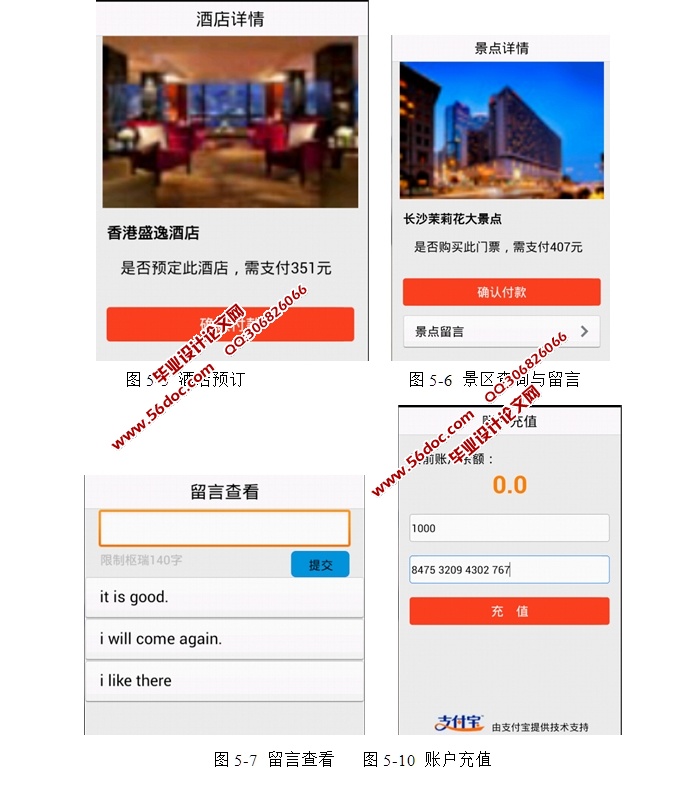 基于安卓Android旅游景点软件的设计与实现(MySQL) 来源:wenku7.com 资料编号:WK715309 资料等级:★★★★★ %E8%B5%84%E6%96%99%E7%BC%96%E5%8F%B7%EF%BC%9AWK715309 以下是资料介绍,如需要完整的请充值下载。 1.无需注册登录,支付后按照提示操作即可获取该资料. 2.资料以网页介绍的为准,下载后不会有水印.资料仅供学习参考之用. 密 保 惠 帮助 我要下载该资源 资料介绍 基于安卓Android旅游景点软件的设计与实现(MySQL)(任务书,毕业论文7800字,程序代码,客户端和服务端,MySQL数据库,答辩PPT) 本系统是基于Android的旅游软件。本系统的开发背景是现在人们对快捷生活的不断改进,同时广大Android用户对快捷旅游的要求也越来越强。于是本系统为了满足用户的需求而诞生了。 本文通过对Android的开发环境的描述和Android的编程优势来做为项目的基础,通过对项目的需求分析和可行性分析来确定项目的大体功能和流程,通过编写代码和反复测试来实现项目的基本功能,通过详细设计的文档来加深对项目运行模式的应用,最后经过反复美化和验证完成了项目的细节要求。 本系统的用户可以方便的通过本系统查询并预付各种景区门票,查询并预定自己中意的酒店,轻松便捷的完成旅游的前期准备工作。在开发过程中不断改进测试,并最终完成需求分析的可行性系统。 系统的功能模块说明 本系统分为6个重要的模块,以下将详细的介绍各个模块扮演的角色和他们之间互相的交互配合。 (1)登陆注册模块:在本模块中,用户可以通过输入自己的用户名和密码来进入系统。没有注册会员的用户可以马上注册成为会员,在注册时必须填入必要的信息,通过验证后就成为了本系统的真正的用户。 (2)酒店预订模块:在本模块中,通过登录的用户可以通过本软件提供的酒店来选择或通过搜索来选择自己想要预定的酒店。 (3)景区查询模块:在本模块中,通过登录的用户可以通过预览图片的方式来预览景区的风景,并且可以预付景区门票。 (4)留言查看模块:在本模块中,通过登录的用户可以查看留言,留言字数限定在140字以内。 (5)个人信息修改模块:在本模块中,通过登录的用户可以修改自己在注册时写入的信息。在修改名字后,系统会及时更新。 (6)账户充值模块:在本模块中,通过登录的用户可以在自己的账户上充值,以方便自己在酒店预订和景区查询的付款操作。 目 录 摘 要 i Abstract ii 1 前言 1 1.1 项目背景及意义 1 1.2 项目设计目标 1 2 需求分析 3 2.1 需求提出 3 2.2 任务概述 3 2.3 需求规定 4 2.4 运行环境规定 5 2.5 可行性分析 5 2.5.1 经济可行性 5 2.5.2 技术的可行性 5 2.5.3 社会可行性 5 2.6 系统开发步骤 6 2.7 系统开发的主要技术分析 7 3 Android技术平台与开发环境 8 3.1 Android系统的历史和优点 8 3.2 Android系统的功能特征 8 3.3 Android的系统架构 9 3.4 Android开发环境的搭建 10 4 系统的初步设计 12 4.1 本系统的初步需求 12 4.2 系统的概要设计 12 4.2.1 系统的功能模块说明 12 4.2.2 系统框架设计 13 4.2.3 系统流程分析 13 4.3 业务流分析 15 4.4 MySQL 数据库 15 5 系统的详细设计与具体测试 17 5.1 系统主要界面的设计和实现 17 5.1.1 登录界面 18 5.1.2 注册界面 19 5.1.3 主界面 23 5.1.4 酒店预订 25 5.1.5 景区查询与留言 27 5.1.6 留言查看 28 5.1.7 第二主界面 30 5.1.8 个人信息修改 31 5.1.9 账户充值 32 5.2 程序调试 34 5.3 系统测试与分析 34 5.3.1 测试目的 34 5.3.2 测试原则 34 5.3.3 测试流程 35 5.3.4 测试方法 35 5.4 测试环境和测试条件 35 5.5 系统运行情况及评价 36 结 论 37 参考文献 39 致 谢 40 外文原文 41 中文翻译 49