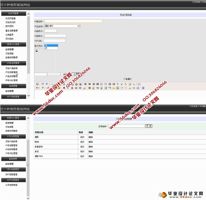 汉中钟楼照相馆网站的设计与实现(ASP.NET,SQL)(含录像) 来源:wenku7.com 资料编号:WK714557 资料等级:★★★★★ %E8%B5%84%E6%96%99%E7%BC%96%E5%8F%B7%EF%BC%9AWK714557 以下是资料介绍,如需要完整的请充值下载。 1.无需注册登录,支付后按照提示操作即可获取该资料. 2.资料以网页介绍的为准,下载后不会有水印.资料仅供学习参考之用. 密 保 惠 帮助 我要下载该资源 资料介绍 汉中钟楼照相馆网站的设计与实现(ASP.NET,SQL)(含录像)(毕业论文13600字,程序代码,SQLServer数据库) 论文阐述了汉中钟楼照相馆网站的开发过程,并对该系统的需求分析及系统需要实现的设计方法作了介绍。该系统的基本功能包括网站前台信息展示和管理员后台信息管理。前台网站包括产品查询,新闻资讯,照相馆介绍信息等;管理员系统包括管理员登录,产品管理,新闻管理等功能。 系统功能模块设计 本系统主要实现一个产品网站销售系统,该系统分为两个大模块,即前台和后台。 前台管理即为普通用户模块,普通用户模块包括用户注册模块、用户登录模块、查找产品模块、照相馆新闻、留言板、产品展示。 (1)用户注册模块:包括普通用户添写用户名、密码、个人信息、身份证号、邮箱等。 (2)用户登录模块:填写用户名、密码登录产品销售系统的首页。 (3)查找模块:实现普通用户按条件查找产品。 开发工具 开发环境:Microsoft Visual Studio 数据库:Microsoft SQL Server 程序语言:ASP.NET(C#)语言 目 录 摘 要 I ABSTRACT II 1 绪论 1 1.1 课题背景 1 1.2 研究现状 1 1.3目的意义 2 2 开发环境介绍 3 2.1 ASP.NET框架 3 2.2 B/S框架 5 2.3 数据库技术 5 2.4互联网信息服务 6 3 需求分析 6 3.1 需求分析 6 3.1.1业务需求分析 6 3.1.2用户需求分析 7 3.1.3功能需求分析 7 3.2 可行性分析 7 4 系统总体设计 9 4.1系统功能模块设计 9 4.2 数据库设计 9 4.2.1 数据概念模型的设计 10 4.2.2 数据物理模型的设计 11 5 详细设计 14 5.1运行环境和开发平台 14 5.1.1 硬件设备及操作系统 14 5.1.2系统开发平台 14 5.1.3 数据库连接方式 14 5.2系统主要功能模块设计 14 5.2.1 用户登陆模块的详细设计与实现 15 5.2.2 产品信息管理模块的详细设计与实现 16 5.2.3 新闻信息管理模块的详细设计与实现 17 5.2.4 会员管理模块的详细设计与实现 18 5.2.5 查询信息模块的详细设计与实现 18 5.2.6 用户注册模块的详细设计与实现 19 6 系统测试 21 6.1 系统测试方法介绍 21 6.2 功能测试 21 6.3 测试方法 22 6.4 测试概况 22 6.5 系统的性能测试 24 6.6 测试分析 24 结 论 25 参考文献 26 致 谢 27