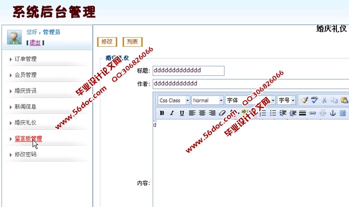 三层架构婚庆公司网站的设计与实现(ASP.NET,SQL)(含录像) 来源:wenku7.com 资料编号:WK715419 资料等级:★★★★★ %E8%B5%84%E6%96%99%E7%BC%96%E5%8F%B7%EF%BC%9AWK715419 以下是资料介绍,如需要完整的请充值下载。 1.无需注册登录,支付后按照提示操作即可获取该资料. 2.资料以网页介绍的为准,下载后不会有水印.资料仅供学习参考之用. 密 保 惠 帮助 我要下载该资源 资料介绍 三层架构婚庆公司网站的设计与实现(ASP.NET,SQL)(含录像)(毕业论文10400字,程序代码,SQLServer数据库) 功能需求分析 婚庆网站系统是针对用户要求用计算机,对婚庆中的知识、婚庆服务项目以及相关的各种信息,进行记录、修改、添加、删除而设计的一种现代化管理软件。 通过需求分析,本系统需要具有以下功能: (1)由于一项新的软件在被使用之前,对于使用者来说是陌生和崭新的,所以要求系统具有良好的人机界面。 (2)能够婚庆服务管理系统的各项功能,能成功的对用户各种信息进行管理。 (3)查询、修改、删除、添加数据方便,数据的稳定性和可靠性好。 系统采用B/S模式。整个系统最关键的就是数据库系统,一个强大的数据库可以支持完善一个优秀的软件设计,通过软件系统与数据库系统的连接来实现通过软件界面观察和处理操作数据 开发工具 开发环境:Microsoft Visual Studio 数据库:Microsoft SQL Server 程序语言:ASP.NET(C#)语言 目 录 1 引言 4 2 系统分析 5 2.1 功能需求分析 5 2.2 本系统采用的关键技术 5 2.2.1 ASP.NET运行模式 5 2.2.2 ASP.NET的工作原理 6 2.2.3 ASP.NET的技术特点 7 2.3 用ASP.NET进行动态网页设计 8 2.2.1 ASP.NET内置对象和组件 9 2.2.2 ASP.NET访问数据库工作原理 10 2.3 可行性分析 11 2.4 系统运行环境 12 3 系统概要设计 13 3.1 总体功能 13 3.2 E-R图 14 4 系统详细设计 14 4.1 后台数据库设计 14 4.1.1 SQL SERVER 介绍 14 4.1.2 数据库表结构 15 4.2 处理流程设计 16 4.2.1 系统操作流程 16 4.2.2 数据增加流程 17 4.2.3 数据修改流程 17 4.3.4 数据删除流程 18 4.3 系统模块设计 19 4.3.1 首页 19 4.3.2 婚庆资讯 21 4.3.3 婚庆礼仪 23 4.3.4 后台管理 23 5 系统调试与测试 24 5.1 程序调试 24 5.2 程序的测试 24 5.2.1 测试的重要性及目的 24 5.2.2 测试的步骤 26 5.2.3 测试的主要内容 26 6 结论 28 6.1 系统评价 28 6.2 安全性问题 28 致谢 30 参考文献 31