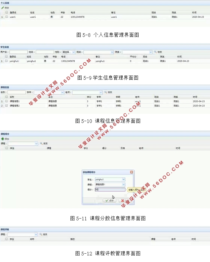 学生成绩管理系统的设计与实现(SSM,MySQL)(含录像) 来源:wenku7.com 资料编号:WK715936 资料等级:★★★★★ %E8%B5%84%E6%96%99%E7%BC%96%E5%8F%B7%EF%BC%9AWK715936 以下是资料介绍,如需要完整的请充值下载。 1.无需注册登录,支付后按照提示操作即可获取该资料. 2.资料以网页介绍的为准,下载后不会有水印.资料仅供学习参考之用. 密 保 惠 帮助 我要下载该资源 资料介绍 学生成绩管理系统的设计与实现(SSM,MySQL)(含录像)(论文10000字,程序代码,MySQL数据库) 本课题要求实现一套学生成绩管理系统的开发与实现,主要实现功能包括管理员、老师和学生,管理员:个人信息、学校基础、人员信息、课程信息、课程评教等功能。老师:个人信息、学生信息、课程信息、课程分数、课程评教等功能。学生:个人信息、课程信息、课程分数、课程评教等功能。学生不能查看系统功能,不能使用系统,只有注册成为学生才能开始使用系统功能。所有学生进入本网站可以浏览预约学生成绩管理系统等功能。所有系统功能共三类学生使用包括管理员、老师和学生进行使用。 开发环境:MyEclipse 程序语言:Java Web服务器:Tomcat 数据库:MySQL 目 录 第一章 绪 论 1 1.1 研究背景 1 1.2 研究现状 1 1.3系统发展 2 第二章开发技术介绍 3 2.1Eclipse介绍 3 2.2jsp技术 3 2.3MySql数据库 4 2.4B/S结构 5 第三章系统分析 7 3.1 可行性分析 7 3.1.1 技术可行性 7 3.1.2 操作可行性 7 3.1.3 经济可行性 8 3.2系统性能分析 8 3.3 需求分析 8 3.3.1管理员用例图 9 3.3.2老师用例图 9 3.3.2学生用例图 10 3.4 业务流分析 11 第四章系统设计 13 4.1 系统概述 13 4.2 系统的功能结构图 13 4.3 数据库概念结构设计 14 4.4 数据库逻辑结构设计 18 第五章 系统功能实现 21 5.1 登录界面 21 5.2管理员功能 21 5.2.1个人信息管理 22 5.2.2学校基础管理 22 5.2.3人员信息管理 22 5.2.4课程信息管理 23 5.2.5课程评教管理 23 5.3老师功能 24 5.3.1个人信息管理 24 5.3.2学生信息管理 24 5.3.3 课程信息管理 24 5.3.4 课程分数管理 24 5.3.5 课程评教管理 25 5.4学生功能 25 5.4.1个人信息管理 25 5.4.2课程信息管理 25 5.4.3课程评教管理 26 5.4.4课程分数管理 26 5.4.5学生中心 26 第六章系统测试 28 6.1 系统测试目的 28 6.2 主要模块测试 28 6.3 测试结论 30 总结 31 参考文献 32 致 谢 33