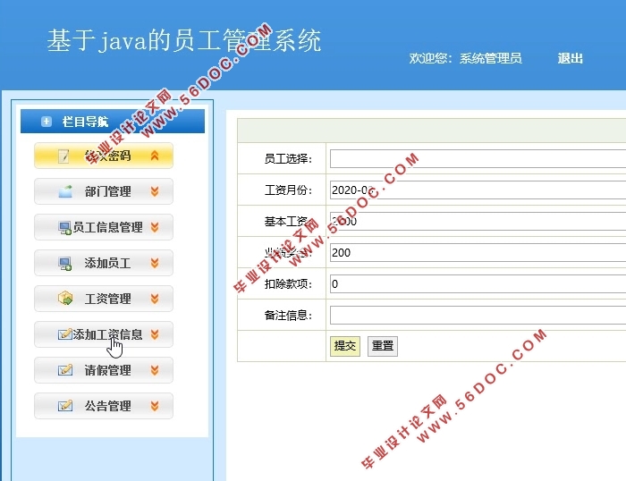 基于Java的员工管理系统的设计与实现(MySQL)(含录像) 来源:wenku7.com 资料编号:WK715949 资料等级:★★★★★ %E8%B5%84%E6%96%99%E7%BC%96%E5%8F%B7%EF%BC%9AWK715949 以下是资料介绍,如需要完整的请充值下载。 1.无需注册登录,支付后按照提示操作即可获取该资料. 2.资料以网页介绍的为准,下载后不会有水印.资料仅供学习参考之用. 密 保 惠 帮助 我要下载该资源 资料介绍 基于Java的员工管理系统的设计与实现(MySQL)(含录像)(开题报告,论文11000字,程序代码,MySQL数据库) 本系统将使用JSP编程语言和MYSQL数据库进行开发,Myelcpse作为开发工具,后台数据库的连接采用JDBC直连的方式,最终完成系统的开发,实现各项添加、查询等功能。系统使用简单方便,界面一目了然,基于B/S模式下开发。 功能需求分析 本员工信息管理系统在功能模块主要分为两大方面,即用户功能模块和管理员功能模块。下面对这两方面进行功能分析: 用户:登陆系统,主要功能包括修改个人信息,查看公告信息,我的薪资,在线请假等模块。 管理员:系统管理员通过正确的账号密码进行登录系统后台,功能有:个人密码修改,部门管理,添加部门,员工管理,通知公告管理,薪资管理,请假审核等功能模块。 开发环境:MyEclipse Web服务器:Tomcat 数据库:MySQL 目 录 ABSTRACT 1 第一章 概述 1 1.1 研究背景 1 1.2 开发意义 1 1.3 设计思想 1 1.4 设计原则 2 第二章 系统开发理论基础 3 2.1 开发工具 3 2.2 JSP技术 3 2.3 JAVA简介 4 2.4 JavaScript 5 2.5 HTML简介 5 第三章 系统分析 7 3.1需求分析 7 3.1.2 用户需求分析 7 3.1.3 功能需求分析 7 3.1.4 非功能需求分析 7 3.2 可行性分析 8 3.2.1 技术可行性 8 3.2.2 经济可行性 8 3.2.3 操作可行性 9 3.3 系统流程分析 9 3.3.1添加员工 9 3.3.2用户登录 9 第四章 系统设计 11 4.1 系统功能模块图 11 4.2 系统架构设计 11 4.3 系统用例分析 11 4.4数据库设计 12 4.4.1 数据库设计原则 12 4.4.2 数据库概念设计 13 4.4.3 数据库表设计 13 第五章 系统的实现 15 5.1登录界面 15 5.2 管理员主界面 15 5.2.1修改密码界面 16 5.2.2员工信息管理 16 5.2.3部门管理 17 5.2.4工资信息管理 17 5.2.5通知公告管理 18 5.2.6请假信息管理 19 5.3 员工主界面 19 5.3.1修改个人信息 20 5.3.1我的薪资 20 5.3.1在线请假 21 第六章 系统测试 22 6.1系统测试目的与意义 22 6.2 系统功能测试 22 6.3 系统测试过程 22 6.4 系统性能测试 23 6.5 测试结果分析 23 总 结 24 参考文献 25 致 谢 27