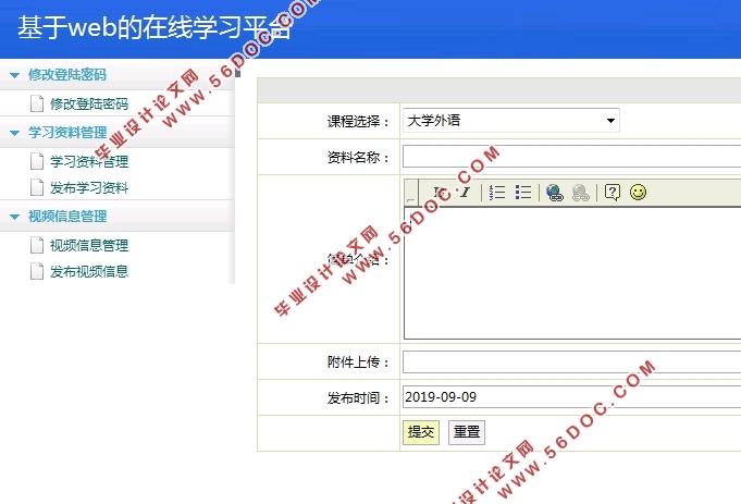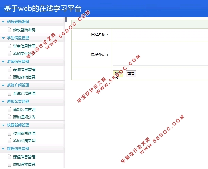 基于WEB的在线学习平台的设计(Javaweb,MySQL)(含录像) 来源:wenku7.com 资料编号:WK715961 资料等级:★★★★★ %E8%B5%84%E6%96%99%E7%BC%96%E5%8F%B7%EF%BC%9AWK715961 以下是资料介绍,如需要完整的请充值下载。 1.无需注册登录,支付后按照提示操作即可获取该资料. 2.资料以网页介绍的为准,下载后不会有水印.资料仅供学习参考之用. 密 保 惠 帮助 我要下载该资源 资料介绍 基于WEB的在线学习平台的设计(Javaweb,MySQL)(含录像)(论文11000字,程序代码,MySQL数据库,答辩PPT) 本管理系统将使用JSP编程语言和MYSQL数据库进行开发,Myelcpse作为开发工具,后台数据库的连接采用JDBC直连的方式,最终完成系统的开发,实现各项添加、查询等功能。系统使用简单方便,界面一目了然,基于B/S模式下开发。 功能需求分析 本在线学习平台在功能模块主要分为3大方面,即学生功能模块、老师和管理员功能模块。下面对这两方面进行功能分析: 学生用户:进入前台网站,主要包括系统首页,系统公告信息,用户注册,用户登陆,视频观看下载。学习资料浏览,查看相关的信息。 管理员:系统管理员通过正确的账号密码进行登录系统后台,功能有:个人密码,修改,新闻资讯管理,学生信息管理,系统介绍管理,系统公告管理,老师信息管理等功能模块。 老师:修改个人信息,发布学习资料,教学视频管理等 。 开发环境:MyEclipse Web服务器:Tomcat 数据库:MySQL 目 录 ABSTRACT 1 第一章 概述 1 1.1 研究背景 1 1.2 开发意义 1 1.3 设计思想 1 1.4 设计原则 2 第二章 系统开发理论基础 3 2.1 开发工具 3 2.2 JSP技术 3 2.3 JAVA简介 4 2.4 JavaScript 5 2.5 HTML简介 5 第三章 系统分析 7 3.1需求分析 7 3.1.2 用户需求分析 7 3.1.3 功能需求分析 7 3.1.4 非功能需求分析 8 3.2 可行性分析 8 3.2.1 技术可行性 8 3.2.2 经济可行性 9 3.2.3 操作可行性 9 3.3 系统流程分析 9 3.3.1用户注册 9 3.3.2用户登录 10 第四章 系统设计 11 4.1 系统功能模块图 11 4.2 系统架构设计 11 4.3数据库设计 11 4.3.1 数据库设计原则 12 4.3.2 数据库概念设计 12 4.3.3 数据库表设计 12 第五章 系统的实现 14 5.1 网站主界面 14 5.1.1 用户注册功能 14 5.1.2 学习资料下载 15 5.2后台登录界面 15 5.3 管理员主界面 16 5.3.1修改密码界面 17 5.3.2学生信息管理 17 5.3.3老师信息管理 17 5.3.4课程信息管理 18 5.3.5系统公告管理 19 5.3.6系统介绍管理 19 第六章 系统测试 20 6.1系统测试目的与意义 20 6.2 系统功能测试 20 6.3 系统测试过程 20 6.4 系统性能测试 21 6.5 测试结果分析 21 总 结 22 参考文献 23 致 谢 25