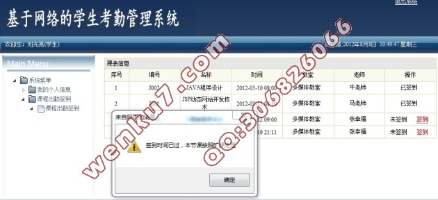 jsp学生考勤管理系统 来源:wenku7.com 资料编号:WK72044 资料等级:★★★★★ %E8%B5%84%E6%96%99%E7%BC%96%E5%8F%B7%EF%BC%9AWK72044 以下是资料介绍,如需要完整的请充值下载。 1.无需注册登录,支付后按照提示操作即可获取该资料. 2.资料以网页介绍的为准,下载后不会有水印.资料仅供学习参考之用. 密 保 惠 帮助 我要下载该资源 资料介绍 设计编号:0140 设计名称:jsp学生考勤管理系统 开发技术:JSP+servlet+javabean+sql2005 系统功能: 通过学生考勤管理系统这个平台,可以实现学生、课程情况的信息化、网络化、系统化、规范化管理,从繁杂的数据查询和统计中解脱出来,更好的掌握学生上课及时率及对学生旷课情况的监督。系统的主要功能包括:学生信息管理、课程信息管理与学生上课签到。 本系统前台主要使用JSP作为开发语言,后台使用SqlServer作为数据库管理系统,开发环境是MyEclipse,服务器采用tomcat,开发出的一个基于Web技术的B/S结构的学生考勤管理系统。 关键词:学生考勤、管理系统,JSP,B/S结构