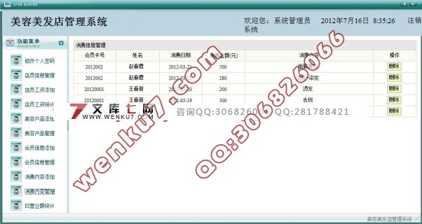 系统主要提供管理员进行员工及工资管理、美容美发产品管理、会员管理、消费及营业额统计。将美容美发店管理的各个环节应用现代信息技术,使资源得到可靠的保存和有效的利用,促进美容美发店管理水平的提高。