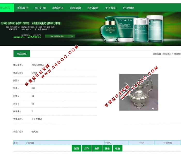 购物网站的设计与实现(PHP,MySQL)(含录像) 来源:wenku7.com 资料编号:WK716296 资料等级:★★★★★ %E8%B5%84%E6%96%99%E7%BC%96%E5%8F%B7%EF%BC%9AWK716296 以下是资料介绍,如需要完整的请充值下载。 1.无需注册登录,支付后按照提示操作即可获取该资料. 2.资料以网页介绍的为准,下载后不会有水印.资料仅供学习参考之用. 密 保 惠 帮助 我要下载该资源 资料介绍 购物网站的设计与实现(PHP,MySQL)(含录像)(毕业论文10000字,程序代码,MySQL数据库) 本项目是通过B/S框架技术来进行设计和实现的。项目主要用到的技术有php,phpscript,html/css等。数据库使用的是MySQL。 购物网站共分为两个部分,一部分是面向用户的前台部分,包括:用户的注册、登陆、查看商品信息、购物、提交订单、对商品进行查询等操作。另外一部分是网站的后台管理部分,这部分包括:对普通用户的账号进行删除、更改、查询管理,商品的管理、订单的管理等。 目 录 第1章 绪论 4 1.1 引言 4 1.1 开发背景 4 第2章 关键技术介绍 5 2.1 系统关键技术PHP 5 2.2 系统关键技术MYSQL 5 2.3可行性分析 5 2.3.1 经济可行性 5 2.3.2 功能可行性 5 2.3.3 技术可行性 5 第3章 系统分析 7 3.1 系统功能说明 7 3.2数据流程分析 9 第4章 系统设计 11 4.1体系结构设计 11 4.2系统详细设计 12 4.3数据库设计 14 4.3.1 概念模型设计 14 4.3.2 数据库表设计 15 第5章 系统实现 19 5.1数据库连接说明 19 5.2系统前台主要功能实现 19 5.2.1 首页实现 19 5.2.2商品分类展示实现 21 5.2.3商品详情实现 22 5.2.4购物车实现 23 5.3系统后台主要功能实现 25 5.3.1管理员登陆实现 25 5.3.2商品管理实现 26 5.3.3订单管理实现 27 第6章 系统测试 29 6.1 测试用例 29 6.2 测试结果分析 30 第7章 结 论 32 参考文献 33 致 谢 34