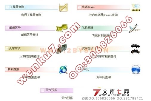 用户分为一般用户和系统管理员两种。 一般用户只能实现“信息查询” 功能模块和相应的功能子模块。如:校内电话E-mail查询模块可分为选择单位查询和直接输入查询;邮编区号查询模块可分为按地图查询、选择地区查询、按邮编查询和按区号查询;飞机时刻表查询模块分为按航班号查询、按目的地查询、按班期查询和按机型查询;火车时刻表查询模块分为按车次查询和按目的地查询;长途汽车时刻表查询模块可分为选择目的地查询和输入目的地查询;教师工作量查询模块、校历查询模块、万年历查询模块、精彩网站查询模块、天气预报查询模块均为链接查询。 而系统管理员则可以实现“信息增加”功能模块,“信息浏览”功能模块,“信息删除”功能模块,“系统更新”功能模块。其中各功能模块又分为若干功能子模块。如:“信息增加”功能模块又可分为“校内电话E-mail信息增加”、“邮编区号信息增加”、“飞机时刻表信息增加”、“火车时刻表信息增加”和“长途汽车时刻表信息增加”;“信息浏览”功能模块分为“校内电话E-mail信息浏览”、“邮编区号信息浏览” 、“飞机时刻表信息浏览” 、“火车时刻表信息浏览”和“长途汽车时刻表信息浏览”;“信息删除”功能模块分为“校内电话E-mail信息删除”、“邮编区号信息删除”、“飞机时刻表信息删除”、“火车时刻表信息删除”、“长途汽车时刻表信息删除”;“系统更新”功能模块又分为“校内电话E-mail系统更新”、“邮编区号系统更新”、“飞机时刻表系统更新”、“火车时刻表系统更新”、“长途汽车时刻表系统更新” 。