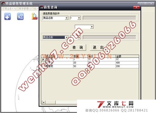 开发的主要内容 现今药品销售管理的繁琐给具有强烈时间观念的药品销售人员带来了诸多不便,面对庞大的信息量,为了减轻销售管理人员的工作负担,就要有药品销售管理系统来提高药品销售工作的效率。使用这样的系统,可以做到药品销售信息的规范管理,科学统计和快速查询,从而减少管理方面的工作量。 通过对传统的依靠管理人员人工传递信息和数据的管理方式的分析。明白了管理人员应该需要一个功能完善,特点突出,操作便利,具有相当的分析和预测能力的管理信息系统。具体要求如下: ① 要求订单、出库单等一次输入,自动显示,自动生成报表,并能按用户要求打印单据和报表。 ② 要求查询方便、快捷,能够按时间和业务种类统计。 ③ 因为各级管理人员对业务的操作不尽相同,所以要求有用户登录及权限管理功能。 ④ 操作员对计算机并不精通,所以要求本系统能尽量简化操作,使输入单据的过程尽量与真实单据的输入过程相似,使操作过程简单易懂,明白易学。 本软件即为一个基本的药品销售管理系统,系统对企业中常见的采购,库存,销售等活动以及相关的供应商和客户等基本信息进行管理。力求通过本软件,能帮助管理人员利用计算机快速方便的对药品销售信息进行输入、输出、查找、修改的各种操作,使散乱的药品销售信息能够更加的具体化,直观化和合理化。