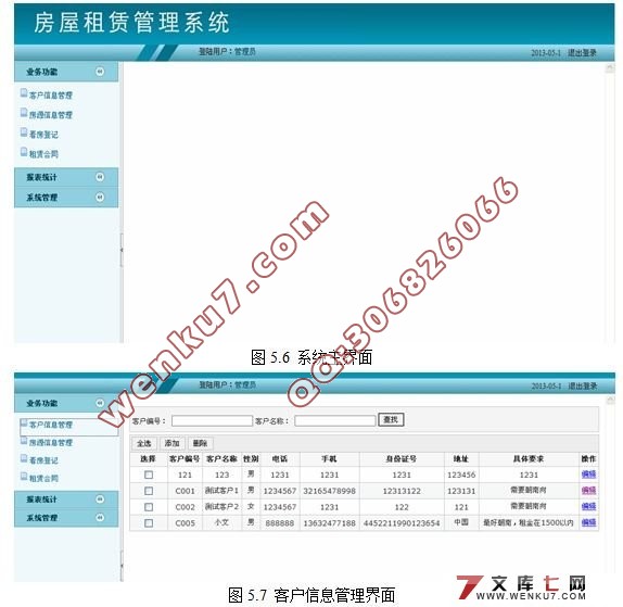 (5)租赁合同管理,主要包括:日期,房源编号,业主名称,性别,电话,手机,业主身份证号,房型,面积,楼层,详细地址,客户编号,客户名称,客户性别,客户电话,客户手机,客户身份证号,合同期限,交租时间,交租方式,租金,中介费,销售人员,房屋用途说明,违约责任说明。