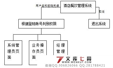 采用本系统可以大大减少前台的服务人员的人数,直接和厨房联系加快上菜速度。由于采用计算机操作,可以大大提高操作速度。为了能够适应信息化发展的需要,提高餐饮部门的工作效率,引入了该信息系统。 系统应有以下一些功能: 1)包括餐饮收银等各综合收银点; 2)菜谱管理、台号(场所)管理; 3)开单、点菜、加菜、退菜、结账、免单; 4)换台、支持一单结帐和多单合并结帐; 5)各类收银班报表、日报表及统计报表; 6)餐厅转前台帐、查询总营业情况; 7)信息查询、服务员交接班及定制报表; 3.2 系统设计思想 在今后几年中,酒店的竞争将主要在智能化、信息化方面展开。店内装潢、客房数量、房间设施等质量竞争和价格竞争将退居二线。酒店信息化的发展趋势主要分为三大应用领域:一是为酒店的管理者、决策者提供及时、准确地掌握酒店经营各个环节情况的信息技术;二是针对酒店的经营,为节省运营成本、提高运营质量和管理效率提供的信息化管理和控制技术;三是直接面对顾客所提供的信息化服务。 采用全新的计算机网络和信息管理系统,可以在以下几个方面提高酒店的管理效率,改善服务水准。 (1) 为销售提供全面、准确的信息数据。酒店销售以客人为中心,需要了解客人需求,细分目标市场,适销对路。酒店销售的核心产品是客房,以合理的价格在相应的时间将客房销售出去是使销售具有成效的关键。 (2) 为客人提供快捷、细致、周到的服务。酒店业的竞争日益激烈,而竞争的焦点越来越来汇集到酒店的服务质量上。高档酒店衡量标准首先是能否在一个标准的住客流程为客人提供快捷、细致、周到的服务。 在本系统的设计过程中,为了克服这些困难,满足计算机管理的需要,我们采取了下面的一些原则: 1.统一各种原始单据的格式,统一帐目和报表的格式。 2.删除不必要的管理冗余,实现管理规范化、科学化。 3.程序代码标准化,软件统一化,确保软件的可维护性和实用性。 4.界面尽量简单化,做到实用、方便,尽量满足企业中不同层次员工的需要。 5.各类查询数据都可以导出进行存档。 3.3 系统功能描述 本系统共分成三个大的部分:管理员操作部分、业务员操作部分和经理操作部分。在这三个部分又包含了不同的内容所以涉及到权限的问题。 要求酒店餐饮管理系统有以下功能模块,如图3.1: (1)系统管理模块。该模块用于对客房类型、客房价格、客房信息、系统参数等项目进行初始化设置,这些设置一般不轻易改动,其基础设置包括房客类型、信息设置,房价,系统参数设置。 (2)前台营业管理功能模块。此功能模块用于管理客户退房及相关的收银业务,其包括的子功能模块有:记帐操作、客单退房、团体退房、预付金管理、附加费用管理、旅行社佣金管理和费用统计以及分析。 (3)预定管理功能模块。此模块用于管理客户的预定业务,包括预定订单和酒宴服务两方面。 (4)外卖管理功能模块。其功能模块包括外卖订单和送货服务。 (5)员工管理功能模块。此模块可对员工信息进行查询同时查看他的详细信息并且提供聘请和解雇服务。 系统功能包括用户管理、菜单管理、修改密码管理三大功能模块,本系统根据登陆用户的不同权限进行判别然后进入不同的界面,进行不同的操作。