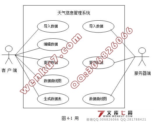系统的功能需求 基于以上的开发目标,系统开发的范围确定如下:本系统只涉及气象信息的管理部分,不包括对数据如何进行测量的内容。本息同提供强大的查询功能。可进行不同类型查询,提供多种索引;本系统提供记录的添加,删除、查询和绘制曲线图等功能。而且可以按月或者按年生成数据报表。同时应实现服务器端和客户端的网络连接通信功能。 3.3.2系统的运行环境 硬件环境: 处理器1GHZ以上,推荐采用INTEL公司的Pentium 4 1.8GHZ处理器; 内存在128M以上,推荐采用256M DDR 内存; 支持TCP/IP 以太网 软件环境: 操作系统:Windows 98 以上。 数据库系统:Access2000 辅助工具:Visal C++ 6.0