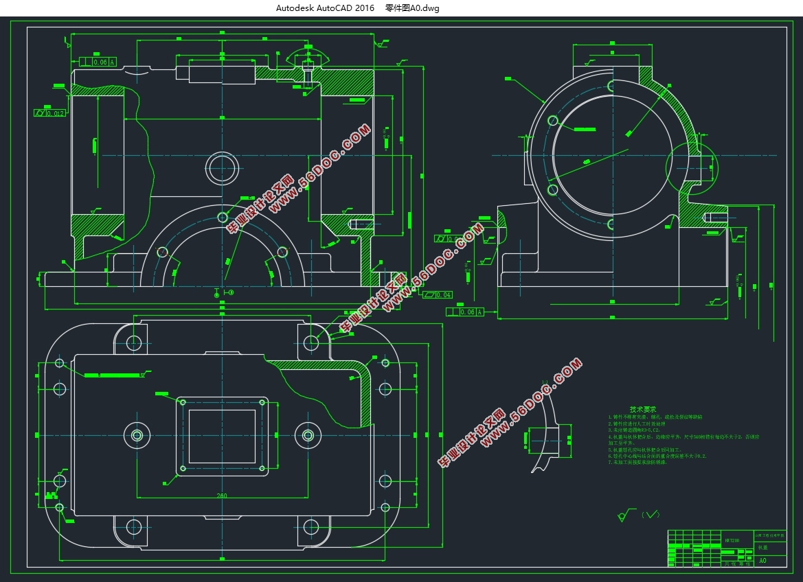 孔轴配合度为H7,表面粗糙度Ra小于3.2um,圆柱度为0.012mm。其它孔的表面粗糙度为Ra小于3.2um,锥销孔的表面粗糙度为Ra小于1.6um,盖体上平面表面粗糙度为Ra小于6.3um,机盖机体的结合面的表面粗糙度为Ra 小于3.2um,结合处的相错位每边不大于2mm,机体的左右端面表面粗糙度为Ra 小于3.2um,垂直度为0.06mm。