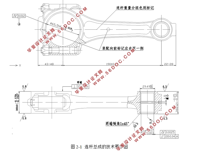 柴油发动机工作时,压缩冲程把燃油和空气的混合物压缩,使温度升高达到其燃点从而点火燃烧在气缸中产生热能,使活塞顶面产生膨胀的压力,此压力由连杆传递给曲轴,而连杆本身又受曲轴的来回推动带动活塞压缩气缸中的气体。在工作中连杆承受着剧烈变化的动载荷。由于连杆在设计过程中要求的尺寸精度、形状精度和位置精度很高,而且连杆的刚性不是很好,很容易发生工件的变形,所以很难达到零件的技术要求。