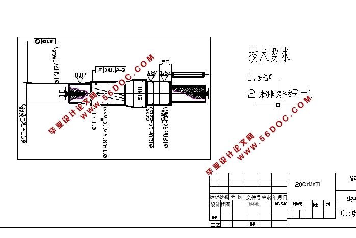过桥齿轮轴的工艺和工装设计(含CAD图,PROE三维图) 来源:wenku7.com 资料编号:WK718953 资料等级:★★★★★ %E8%B5%84%E6%96%99%E7%BC%96%E5%8F%B7%EF%BC%9AWK718953 以下是资料介绍,如需要完整的请充值下载。 1.无需注册登录,支付后按照提示操作即可获取该资料. 2.资料以网页介绍的为准,下载后不会有水印.资料仅供学习参考之用. 密 保 惠 帮助 我要下载该资源 资料介绍 过桥齿轮轴的工艺和工装设计(含CAD图,PROE三维图)(任务书,论文说明书7000字,CAD图纸3张,PROE三维图) 1 零 件 的 分 析 1.1 零件的作用 题目给出的零件是轴类零件(过桥齿轮轴),轴是机械设备中轴承支撑的重要零件之一,它的主要作用是直接支撑回转零件,以实现回转运动并传递转距和动力,如齿轮,车轮,电动机,转子,铣刀等各种作回转运动的零件,都必须安装在轴上,才能实现它们的功用。过桥齿轮轴有联动和传动的作用。由附图1可知,过桥齿轮轴的一端铣有键槽,配合轴与轴上零件的使用;一端滚有斜齿轮,与其他齿轮配合传动。 1.2零件的工艺分析 由附图1可知,析其材料为20CrMnTi。该种材料经过渗碳淬火后强度大,有较高的耐磨性,适用于制造承受中等载荷的耐磨零件。 该零件上的主要加工面为外圆面、键槽、斜齿轮和两个主要中心孔,φ16H7 和ΦM12-6H,其等级精度要求见附图1。 选择定位基准时各外圆的位置公差,采用基准统一原则,即全部以工件的两中心孔定位 。同时也为了保证个外圆的形状与位置公差,在轴的粗加工过程中,用油石顶尖研磨中心孔,中心孔的表面粗糙度Ra值逐次减小,精度也要逐次提高。 为了达到轴的精度要求,逐步消除工件毛坯的复映误差,工序分为粗车,精车,磨削。 零件外圆的粗糙度要求不统一,在加工过程中考虑到时间的原因,先加工到最低等级要求3.2,最后进行研磨达到0.6。有斜齿轮端最外圆公差等级为m5,键槽端外圆公差等级为m6。 有参考文献[1]中有关方面和孔加工的经济精度及机床能达到的位置精度可知,上述技术要求是可以达到的,零件的结构工艺性也是可行的。 目 录 摘要 …………………………………………………………………………………2 英文摘要……………………………………………………………………………2 1、零 件 的 分 析 ………………………………………………………………3 1.1零件的作用…………………………………………………………………3 1.2零件的工艺分析 …………………………………………………………3 2、确定毛坯、画毛坯图…………………………………………………………4 3、工艺规程设计 …………………………………………………………………4 3.1定位基准的选择……………………………………………………………5 3.2制订工艺路线………………………………………………………………6 3.3选择加工设备及刀,夹,量具……………………………………………9 3.4加工工序设计 ……………………………………………………………10 4、夹具设计 ………………………………………………………………………12 4.1夹具设计方案分析 ………………………………………………………12 4.2夹具结构设计计算 ………………………………………………………13 4.3夹具使用说明 ……………………………………………………………13 5、设计小结 ………………………………………………………………………14 6、参考文献 ……………………………………………………………………16 7、致谢 ……………………………………………………………………………17