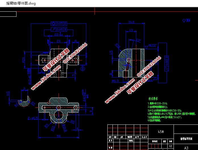 摇臂轴I加工工艺及夹具设计(含CAD零件图夹具图,工艺卡工序卡) 来源:wenku7.com 资料编号:WK718978 资料等级:★★★★★ %E8%B5%84%E6%96%99%E7%BC%96%E5%8F%B7%EF%BC%9AWK718978 以下是资料介绍,如需要完整的请充值下载。 1.无需注册登录,支付后按照提示操作即可获取该资料. 2.资料以网页介绍的为准,下载后不会有水印.资料仅供学习参考之用. 密 保 惠 帮助 我要下载该资源 资料介绍 摇臂轴I加工工艺及夹具设计(含CAD零件图夹具图,工艺卡工序卡)(论文说明书10000字,CAD图纸4张,工艺卡,工序卡) 摘 要 本次设计的主要内容是摇臂轴I加工工艺规程及 孔钻孔夹具的设计。摇臂轴I主要是与其它零件配对使用,其主要加工表面及控制位置为 外圆和与∮10.8孔中心轴线垂直的上下两端面。由零件要求分析可知,保证 孔和与∮10.8孔中心轴线垂直的上下两端面尺寸的同时应该尽量保证其垂直度,这对于后工序装配和总成使用上来说都有重要影响。所以,工序安排时,采取以 外圆精定位夹紧加工后,对 孔进行钻削加工同时成型,以达到加工出来的产品满足要求并且一致性好的目的。因其粗糙度为Ra3.2,可通过钻、绞削工序满足。本文的研究重点在于通过对摇臂轴I的工艺性和力学性能分析,对加工工艺进行合理分析,选择确定合理的毛坯、加工方式、设计高效、省力的夹具,通过实践验证,最终加工出合格的摇臂轴I零件。 关键词:摇臂轴I,工艺规程,钻孔,工艺路线,加工方式; 2、零件的分析 2.1、零件的作用: 题目所给的零件是摇臂轴I,而摇臂轴I一般是圆柱状并带有底座,圆柱体中间一般都有需要摇臂钻床或者铣床加工的有精度的孔,其作用是用来与其它部件进行连接的。此次课题的任务就是”摇臂轴I加工工艺及夹具设计“,通过分析制定摇臂轴I零件的加工工艺和夹具设计,来围绕摇臂轴I这个零件来进行工艺以及夹具设计。 2.2、零件的工艺分析: (1)以主视图为主要加工表面的加工面。 这一组加工表面包括: 摇臂轴I的左右外圆端面 的铣削加工,拐角处的圆角的加工以及2-∮1.5孔的钻削加工,两端 外圆的车削、磨削加工,2X0.5槽的车削加工,其中左右外圆端面的表面粗糙度要求为 ,2-∮1.5孔的表面粗糙度要求为 。 外圆的表面粗糙度为 ,2X0.5槽的表面粗糙度为 。 (2)以俯视图为主要加工表面的加工面。 这一组加工表面包括: ∮10.8孔的钻、绞加工,以及R13圆角的铣削加工,其表面粗糙度为 。 目录 摘 要 3 Abstract 4 1、绪 论 4 2、零件的分析 5 2.1、零件的作用 5 2.2、零件的工艺分析 5 3、确定毛坯,绘制毛坯图、零件图 8 3.1、确定毛坯的制造形式及材料 8 3.2、机械加工余量、工序尺寸及毛坯尺寸的确定 8 4、工艺规程设计 10 4.1、定位基准的选择 10 4.2、制定工艺路线 10 4.3、选择加工设备及刀、夹、量具 14 4.4 确定切削用量及基本工时 16 4.4.1粗铣、精铣∮17外圆端面,保证尺寸50到位 17 4.4.2 粗铣、精铣与∮10.8孔中心轴线垂直的上下两端面,以及圆角R15 18 4.4.3铣∮6.3深8孔 18 4.4.4粗车、精车∮17外圆至尺寸 19 4.4.5粗车2X1.5沟槽至尺寸 19 4.4.6钻2-∮1.5孔 20 4.4.7钻、绞 深45孔........................23 4.4.8钻∮4孔..............................................24 4.4.9钻、绞∮10.8.................................24 4.4.10磨削 外圆至尺寸...........................25 5、钻孔夹具的设计 26 5.1定位基准的选择 26 5.2定位误差的分析 26 5.3切削力及夹紧力的计算 20 5.4夹紧元件及动力装置确定 28 5.5夹具设计及操作的简要说明 28 小 结 28 致 谢 29 参考文献 29