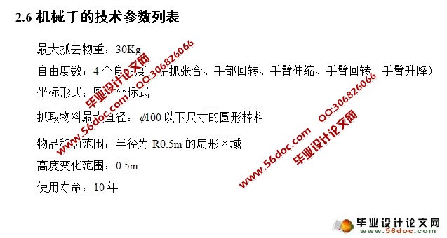 机械手的机械结构主要手抓、手腕、手臂、和机身组成,包括由两个液压回转缸和三个液压伸缩缸,采用液压驱动方案控制机械手运动,用电磁阀控制的液压缸来实现机械手的上升、下降、伸缩、翻转运动及夹紧工件的动作,采用可编程序控制器对机械手实现自动控制。该设计将实现对直径 以下尺寸、重高达30kg的圆形棒料在移动范围半径为0.5m的扇形区域,高度变化范围为:0.5m的区域内进行可编程控制搬运。