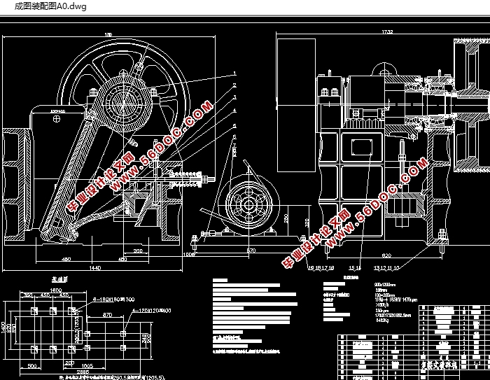带轮与偏心轴固联成一整体,他是运动和动力输入构件,即原动件,其余构件都是从动件。当带轮和偏心轴2绕轴线A转动时,驱使输出构件动鄂3做平面复杂运动,从而将矿石压碎。