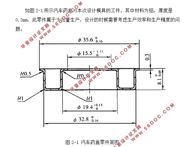 设计中题目是汽车药盒冲压模具设计,首先需要对汽车药盒进行详细的分析,分析一般包含三个方面,分别是材料分析,结构分析和工序分析。该工件汽车药盒材料为铝,属于常用的钣金类材料,冲压性能比较好,结构上总体来说结构基本属于对称,厚度是0.3mm。汽车药盒主要有落料、拉深、二次拉深、整形、修边冲孔的工序,可以采用多个模具完成,由于多个工序同时完成,可以保证高的生成效率,同时还能提高工件的质量。
