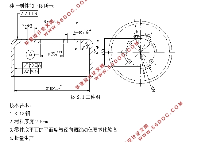 该零件为圆筒形零件,零件的材料为ST12钢板,其化学成分碳(C)≤0.10,锰(Mn)≤0.50,磷(P)≤0.035,硫(S)≤0.035,Alt a≥0.020。其中C可增加碳化铁的数量,提高钢板的屈服强度与抗拉强度,降低塑性,使冲压性能减弱,特别是在CFe3出现于晶界的时候,对冲压性能的不利影响尤其高;锰对冲压性能的直接影响不大,锰与硫产生锰化硫夹杂物,其数量与形态对冲压性能有影响,为了保证ST12钢的拉深性能,其锰的质量分数不应超过0.35%;磷显著的增高钢板的强度,增加脆性,并有偏析倾向,会产生比较多的带状组织,这些都对冲压性能不利;硫产生硫化物,对板料的冲压性能无疑是有害的,它是影响最高的一种元素;铝是钢中最终脱氧剂,与碳产生碳化铝,显著的降低“应变时效”的倾向,容易获得“饼形”铁素体晶粒,能改善冲压性能,ST12钢中铝的质量分数不小于0.02%,最佳值为0.03%~0.05%。零件图上未标注的尺寸公差要求为IT9。