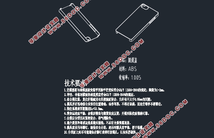 本次设计的塑件为手机保护壳,塑件如下图所示,塑件的结构称不上复杂,结构基本对称,只需要一个侧向抽芯侧型芯机构。塑件在形状上的要求比较规范、基本对称,颜色设计为黑色,但对于表面粗糙度的要求比较高,要尽量避免较大的熔接痕及缩孔,同时也要注意尽量避免产生飞边和毛刺。因此在选择塑件材料时为ABS,塑件的生产规模为中小等批量生产。