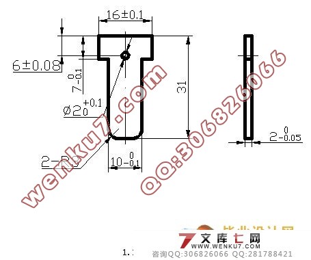 零件图 冲压件的工艺性是指冲压件对冲压工艺的适应性。在一般情况下,对冲压件工艺性影响最大的是几何形状尺寸和精度要求。良好的冲压工艺性应能满足材料较省、工序较少、模具加工较容易、寿命较高、操作方便及产品质量稳定等要求。冲裁各直线或曲线的连接处,宜有适当的圆角。冲裁件凸出或凹入部分宽度不宜太小,并应避免过长的悬臂与窄槽冲孔时,由于受到凸模强度的限制,孔的尺寸不宜过小。冲裁件的孔与孔之间,孔与边缘之间的距离,受到模具强度的限制,不能太小。 1.分析其使用场合及使用要求。该制件是电源插头,装配后,应根据最短尺寸链原则,建议产品设计对制件进行相应的修改,在不提高制件的加工精度要求前提下,改变尺寸标注方法,满足装配尺寸要求。 2.分析其尺寸精度工艺性。满足加工要求。 3.分析其结构工艺性。该制件是典型的落料冲孔件,方便加工。