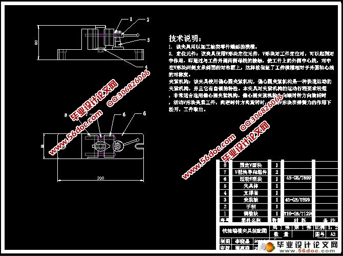 According to different classification, the fixture can be divided into many types,this design is mainly introduced in the shaft end groove milling fixture design,shaft groove milling fixture is a kind of machine tool fixture, which mainly comprises a positioning support element, clamping device, connection oriented elements, tool components or guide element, other devices or components,the six part of the clamp.