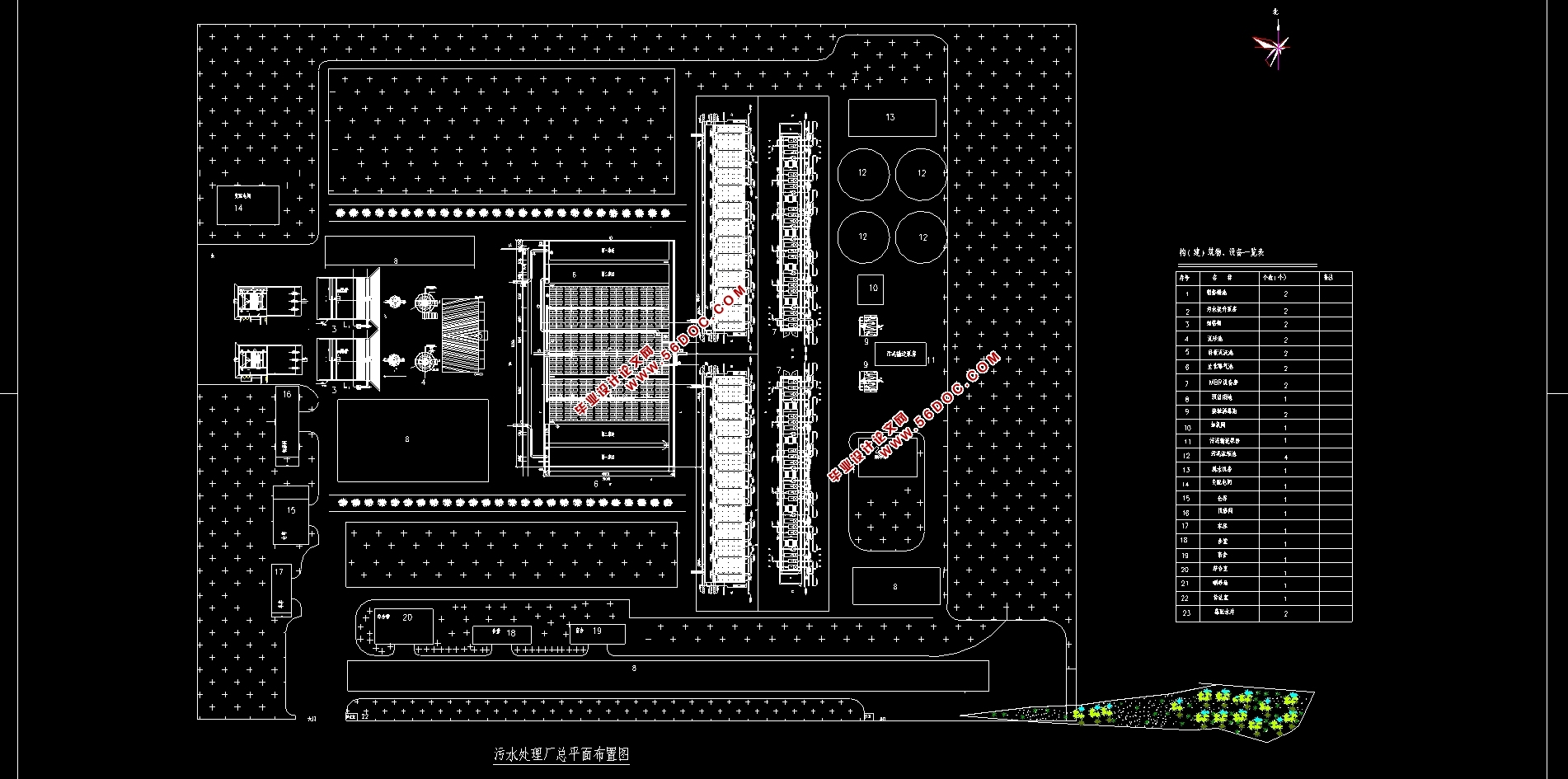(3)设计绘制污水处理厂总平面图、污水处理厂工艺流程图(高程图)各1张,主要处理构筑物的平面图、剖面图不少于10张。