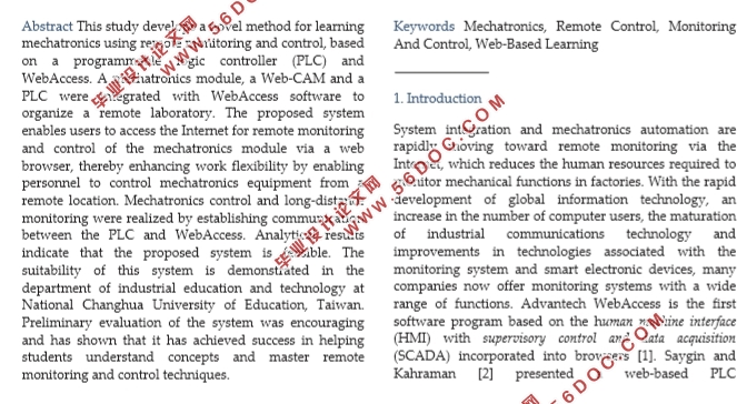 摘要:这项研究开发了一种新颖的、基于在可编程逻辑控制器(PLC)和WebAccess下的、采用远程监控机电一体化的学习方法。机电一体化模块、Web-CAM、PLC与WebAccess软件集成在一起组成一个远程实验室。该系统使用户能够通过网络控制机电一体化模块浏览器访问Internet进行远程监控,从而提高控制偏远地区的机电一体化设备的灵活性。通过建立沟通实现监测PLC和WebAccess之间机电一体化控制和远程控制。分析结果表明该系统是可行的。这个系统适用于中国工业教育以及台湾国立彰化教育大学技术系。对该系统的初步评估较为让人满意,这表明它在帮助学生了解概念并掌握远程教学监测和控制技术方面取得了成功。