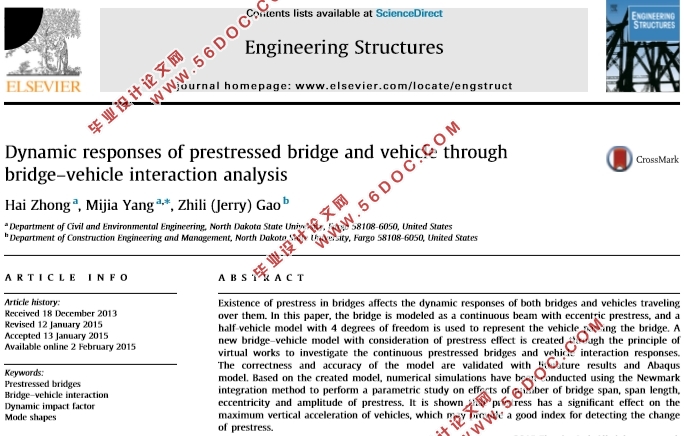 基于车桥耦合的预应力桥梁与车辆动响应分析(中文7000字,英文PDF)