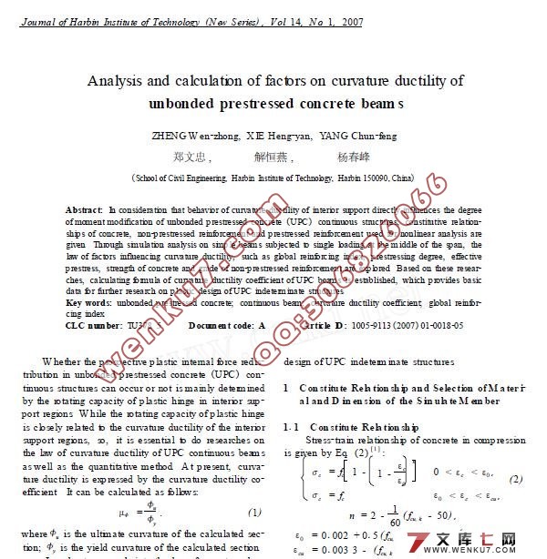 对无粘结预应力混凝土梁曲率延性的分析与计算(中文3200字,英文pdf)